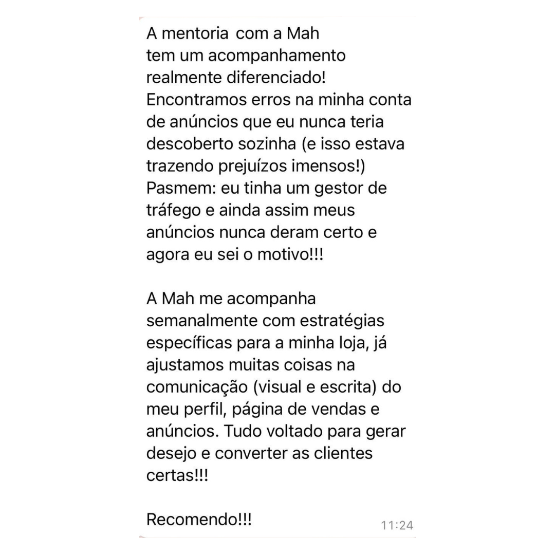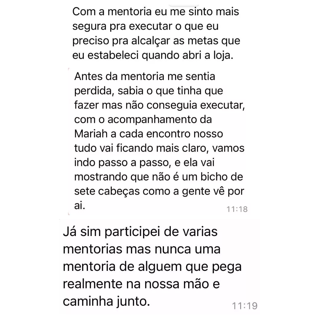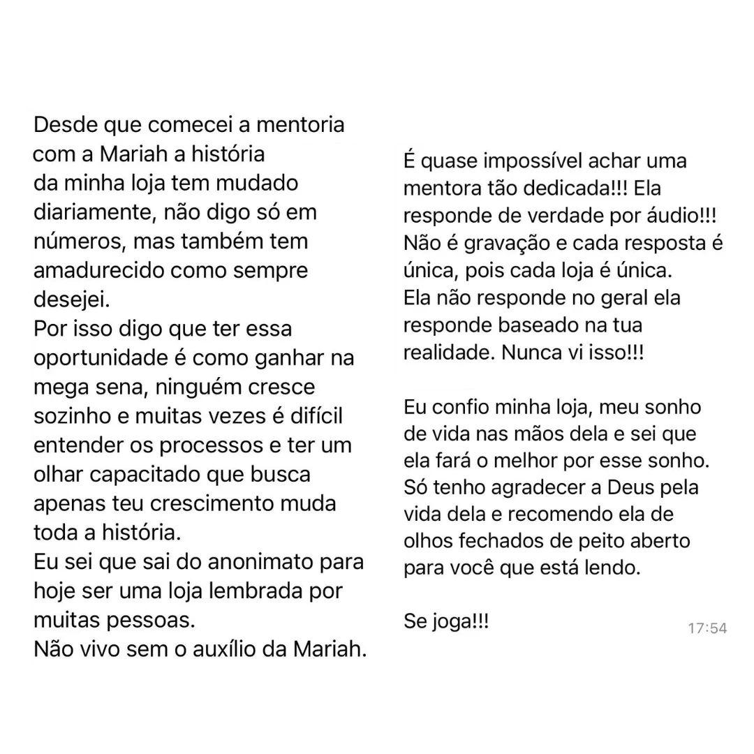 Tenha a mente brilhante da Mariah trabalhando para o seu negócio, criando um Plano Perfeito com estratégias individuais para você alcançar os resultados que deseja com a sua Loja.